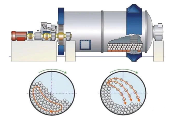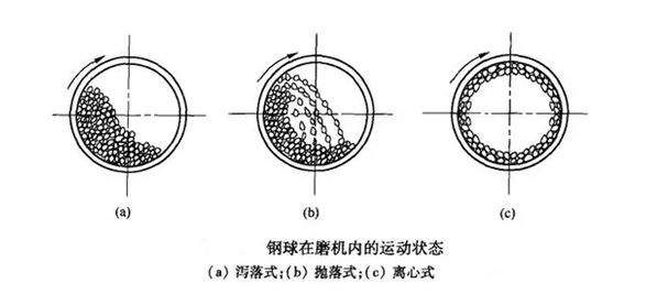 球磨機(jī)是選礦設(shè)備中常用的設(shè)備之一。轉(zhuǎn)速是球磨機(jī)設(shè)計(jì)和操作的主要參數(shù)之一,轉(zhuǎn)速大小直接決定著筒體內(nèi)磨礦介質(zhì)的運(yùn)動(dòng)狀態(tài)和磨礦作業(yè)的效果。轉(zhuǎn)速過(guò)快或過(guò)慢都會(huì)減弱或失去粉碎作用。本文介紹不同轉(zhuǎn)速下不同的磨礦作用效果。